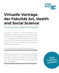 Wir laden Sie regelmäßig herzlich zu unseren virtuellen Live-Kurzvorträgen und Workshops ein. Gemeinsam mit Ihnen widmen wir uns jeweils einem speziellen Thema aus unserem umfangreichen Studienangebot am Campus Arts and Social Change und beantworten gern Ihre Fragen zum Campusalltag am Harburger Binnenhafen.